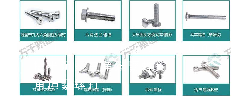 1.機螺釘 2.自攻螺釘 3.鉆尾螺釘 4.墻板釘 5.纖維板釘 6.木螺釘7.六角木螺釘 8.不脫出螺釘 9.組合螺釘 10.微型螺釘 11.家具螺釘 12.電子螺釘頭型:1.六角頭(hexagon head) 2.六角頭法蘭面(hexagon head with flange) 3.