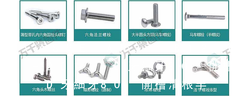 1、Flat:平頭 (鎖入后,頂部與工作件齊平)2、Oval:色拉頭、O頭、半沉頭 3、Round:圓頭 4、Pan:圓扁頭 5、Truss:大圓扁頭 6、Hex:六角頭 A-5:Finish Code/外觀處理。公制自攻螺絲 :于品名后方直接標示 Tapp 主要分類包括普通螺絲、機螺絲、自攻螺絲和膨脹螺絲三種。 有頭螺釘Cap screw 過去限于全牙的扣件。 六角頭螺釘Hex cap screw與大六角螺栓Hex bolt 顧名思義為頭部為六角型的外螺紋扣件,設計為使用扳手轉動。依照ASME B18.2.1標準,六