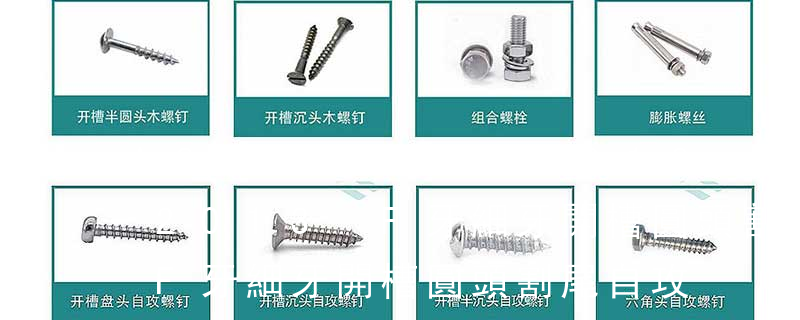 (鐵板牙自攻螺絲) B-2: Plastic Tapping Screw. (塑膠用,自攻螺絲) C: Wooden Screw : 木工螺絲 D: Drywall Screw :水泥墻螺絲 E: Self Drilling Screws鉆尾螺絲(不銹鋼鉆尾螺絲,復合材料鉆尾螺絲) F:膨脹螺絲,四片膨脹螺絲又